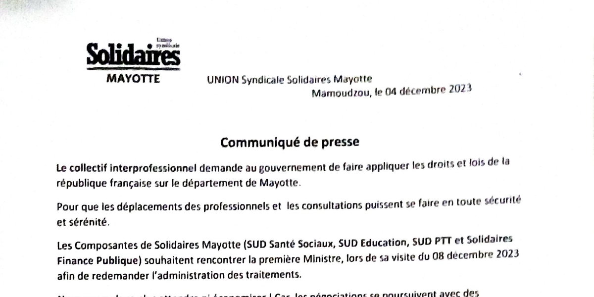 Solidaires Mayotte - Communiqué suite au passage de la 1er ministre à Mayotte