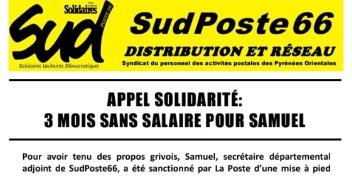 Syndicat SOLIDAIRES UNITAIRES DEMOCRATIQUES, 2 bd Henri Poincaré 66000 Perpignan / syndicat-sud-poste-66@orange.fr