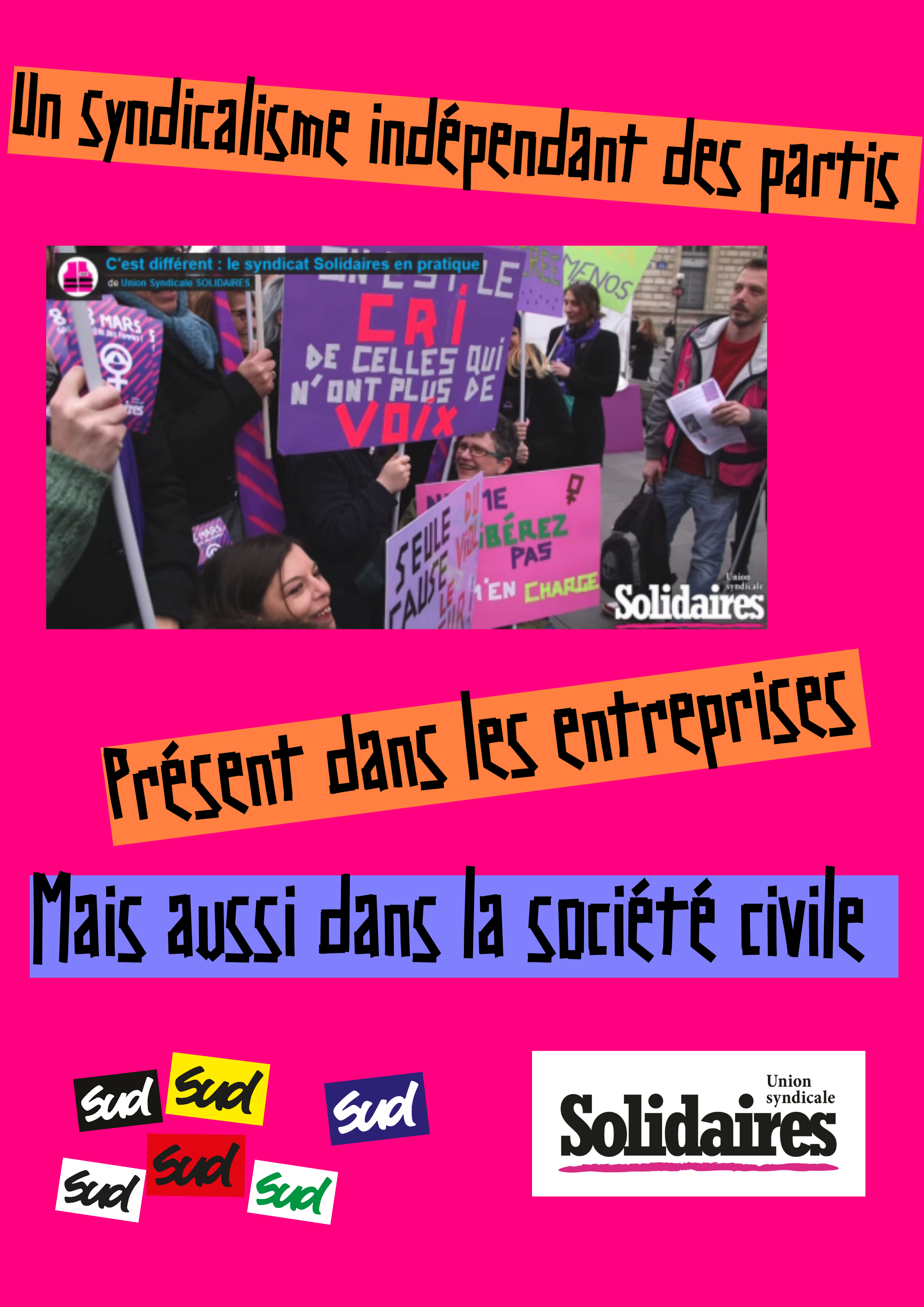 Beaucoup confondent indépendance du syndicalisme par rapport aux partis politiques et apolitisme. En vérité, le fait que Solidaires se réclame d'un syndicalisme de transformation sociale montre bien que ses militant-e-s s'impliquent concrètement dans l'organisation de la cité, et cela procède à l'évidence d'un acte profondément politique et citoyen, cependant très éloigné des pratiques politiciennes dont le but et de conquérir le pouvoir. Le syndicalisme, lui, n'a pas un tel projet. Par contre il vise à redonner la parole à ceux qui ne l'ont pas et élargir le plus possible les prises de décisions qui impactent la vie des gens.