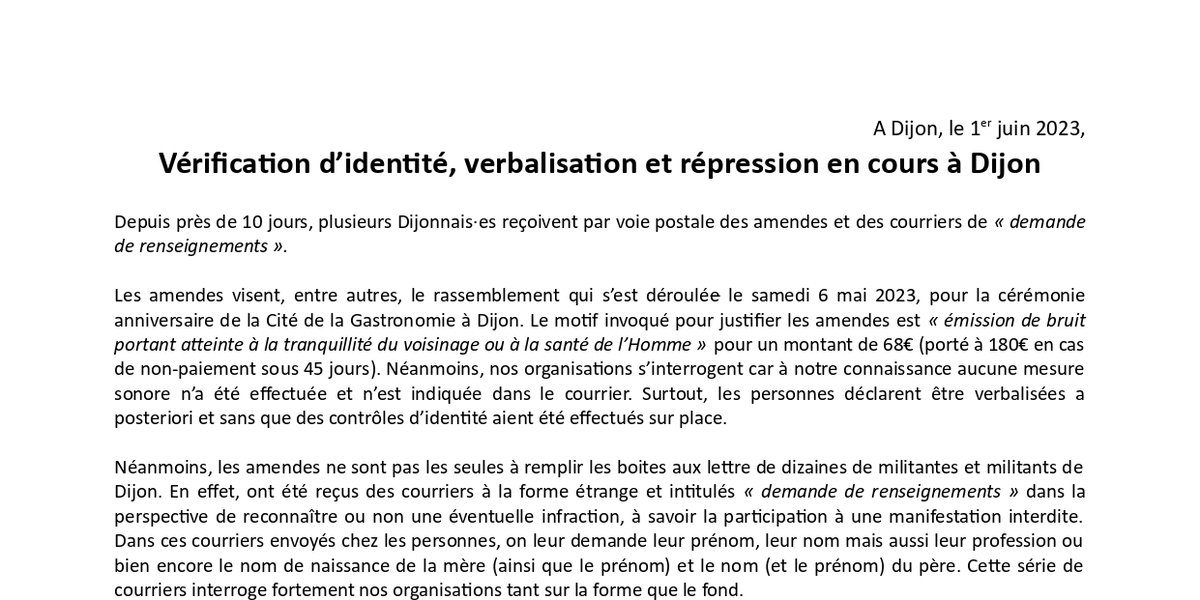 Les amendes visent, entre autres, le rassemblement qui s’est déroulée le samedi 6 mai 2023, pour la cérémonie anniversaire de la Cité de la Gastronomie à Dijon. Le motif invoqué pour justifier les amendes est « émission de bruit portant atteinte à la tranquillité du voisinage ou à la santé de l’Homme » pour un montant de 68€ (porté à 180€ en cas de non-paiement sous 45 jours). Néanmoins, nos organisations s’interrogent car à notre connaissance aucune mesure sonore n’a été effectuée et n’est indiquée dans le courrier. Surtout, les personnes déclarent être verbalisées a posteriori et sans que des contrôles d’identité aient été effectués sur place.