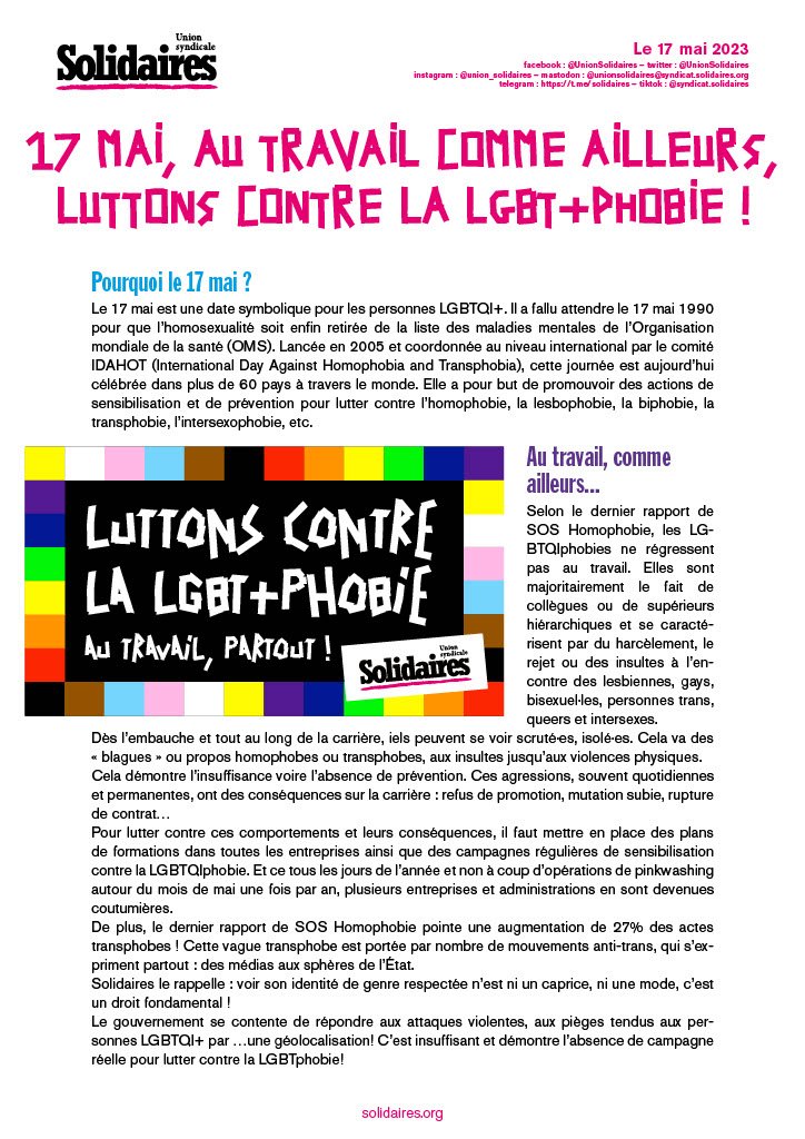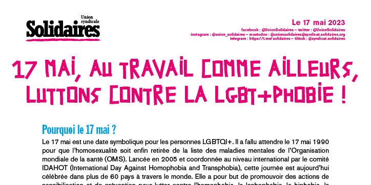 17 mai, au travail comme ailleurs, luttons contre la LGBT+phobie !