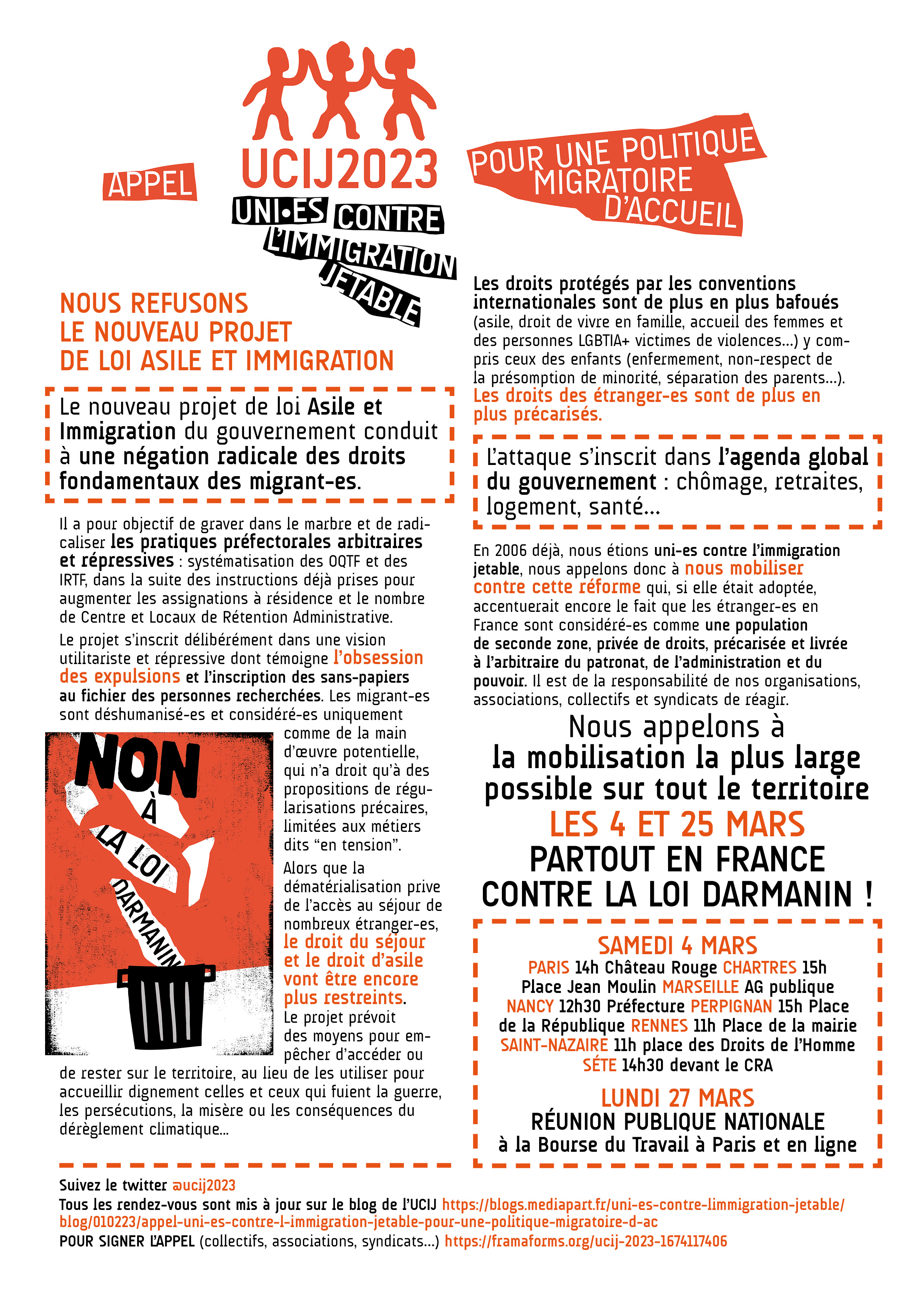 En 2006 déjà, nous étions uni-es contre l'immigration jetable, nous appelons donc à nous mobiliser contre cette réforme qui, si elle était adoptée, accentuerait encore le fait que les étranger-es en France sont considéré-es comme une population de seconde zone, privée de droits, précarisée et livrée à l’arbitraire du patronat, de l’administration et du pouvoir. Il est de la responsabilité de nos organisations, associations, collectifs et syndicats de réagir.