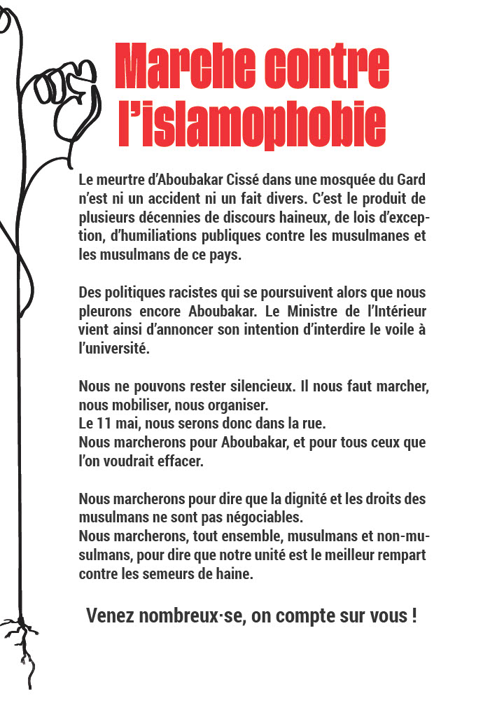 Nous marcherons pour Aboubakar, et pour tous ceux que l’on voudrait effacer. Nous marcherons pour dire que la dignité et les droits des musulmans ne sont pas négociables.