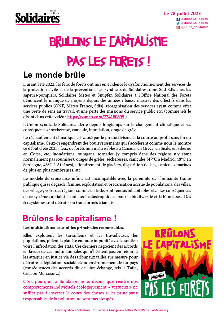 Le réchauffement climatique est causé par le productivisme et la course au profit sans fin du capitalisme. Ceux-ci engendrent des bouleversements qui s'accélèrent comme nous le montre ce début d’été 2023 : feux de forêts non maîtrisables au Canada, en Grèce, en Sicile, en Sibérie, en Corse, etc, inondations, ouragans, tornades (y compris dans des régions n’y étant normalement pas soumises), orages de grêles, sécheresses, canicules (47°C à Madrid, 48°C en Sardaigne, 43°C à Athènes), effondrement de glaciers, disparition de lacs, canicules marines de plus en plus nombreuses, etc.