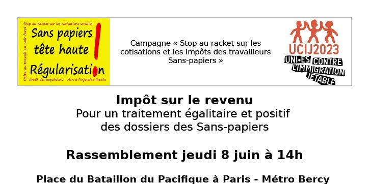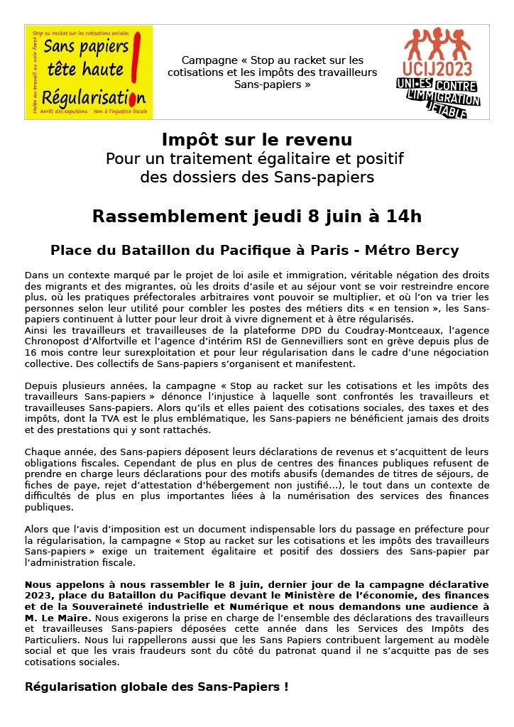 Alors que l’avis d’imposition est un document indispensable lors du passage en préfecture pour la régularisation, la campagne « Stop au racket sur les cotisations et les impôts des travailleurs Sans-papiers » exige un traitement égalitaire et positif des dossiers des Sans-papier par l’administration fiscale.