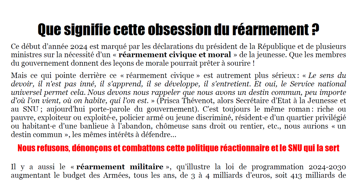 Campagne unitaire contre le SNU - Que signifie cette obsession du réarmement ?