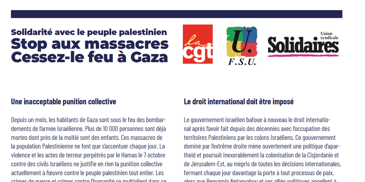 CGT/FSU/Solidaires - Solidarité avec le peuple palestinien. Stop aux massacres. Cessez-le feu à Gaza : Manifestations et rassemblements le 18 novembre 2023