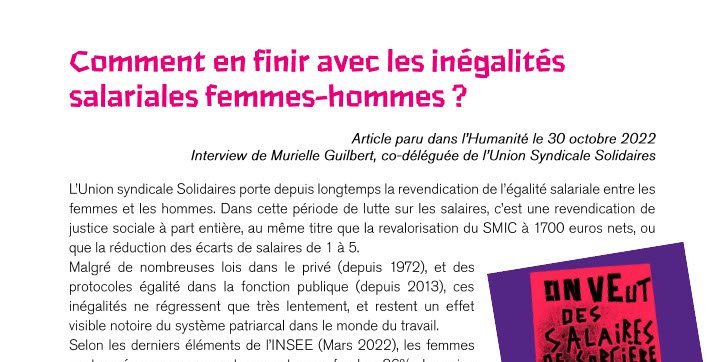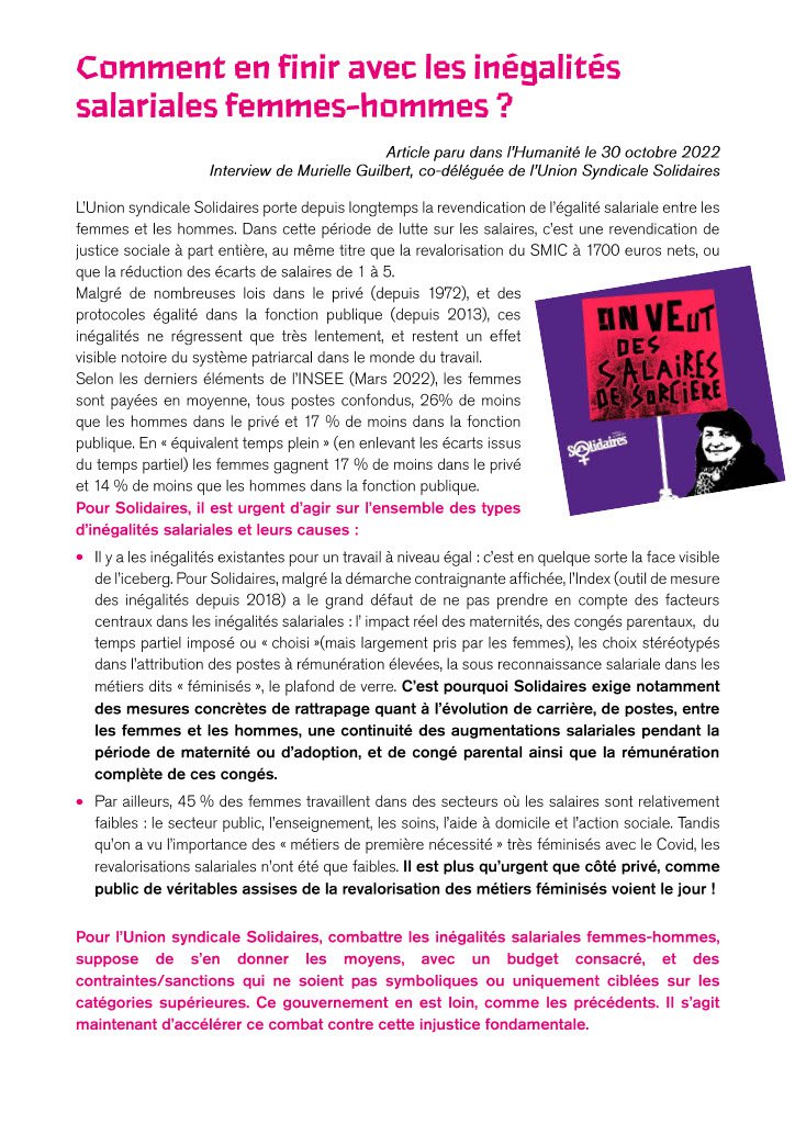 Article paru dans l’Humanité le 30 octobre 2022 - Interview de Murielle Guilbert, co-déléguée de l’Union Syndicale Solidaires