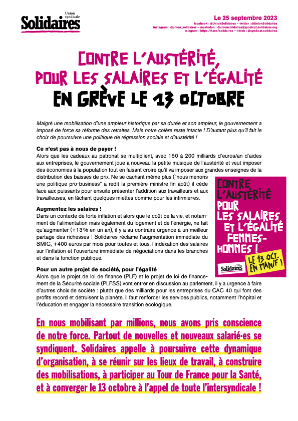 En nous mobilisant par millions, nous avons pris conscience de notre force. Partout de nouvelles et nouveaux salarié·es se syndiquent. Solidaires appelle à poursuivre cette dynamique d’organisation, à se réunir sur les lieux de travail, à construire des mobilisations, à participer au Tour de France pour la Santé, et à converger le 13 octobre à l’appel de toute l’intersyndicale !