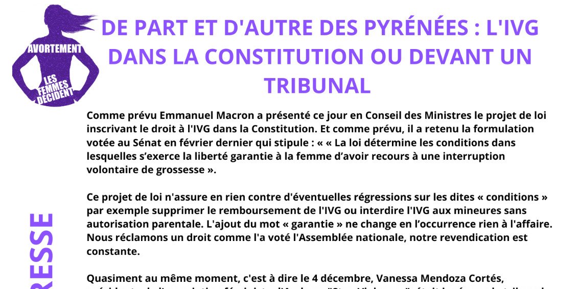 CP du collectif Avortement Europe : DE PART ET D'AUTRE DES PYRÉNÉES : L'IVG DANS LA CONSTITUTION OU DEVANT UN TRIBUNAL !