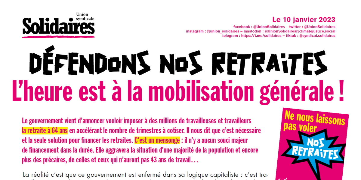 Le gouvernement est en mauvaise posture. L’ensemble des organisations syndicales sont unies pour repousser le projet. Une large majorité de la population y est opposée. Notre mobilisation changera tout ! Toutes et tous ensemble nous pouvons empêcher cette régression sociale. Il va nous falloir engager un bras de fer déterminé.