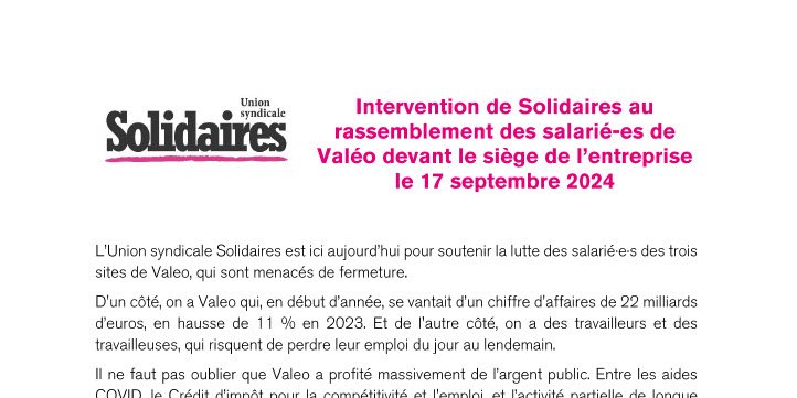 L’Union syndicale Solidaires est ici aujourd’hui pour soutenir la lutte des salarié·e·s des trois sites de Valeo, qui sont menacés de fermeture.