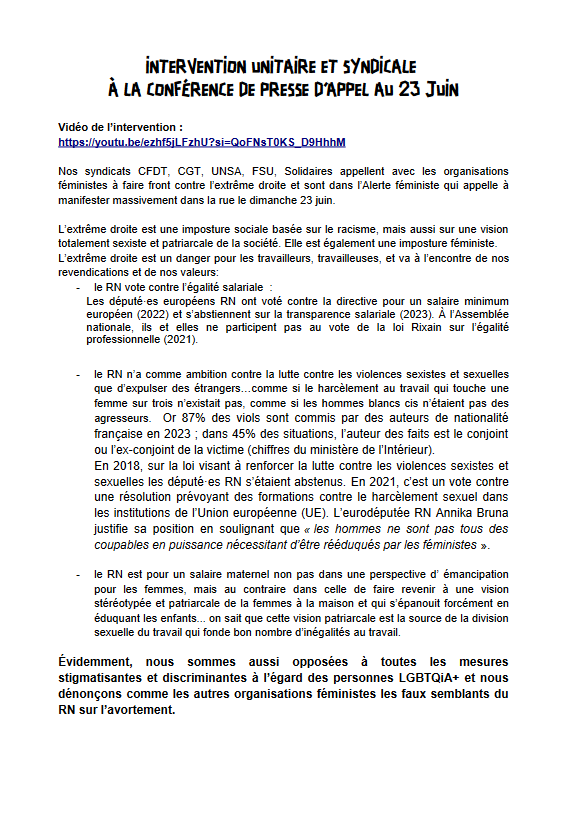 Intervention syndicale et unitaire à la conférence de presse d'appel au 23 juin