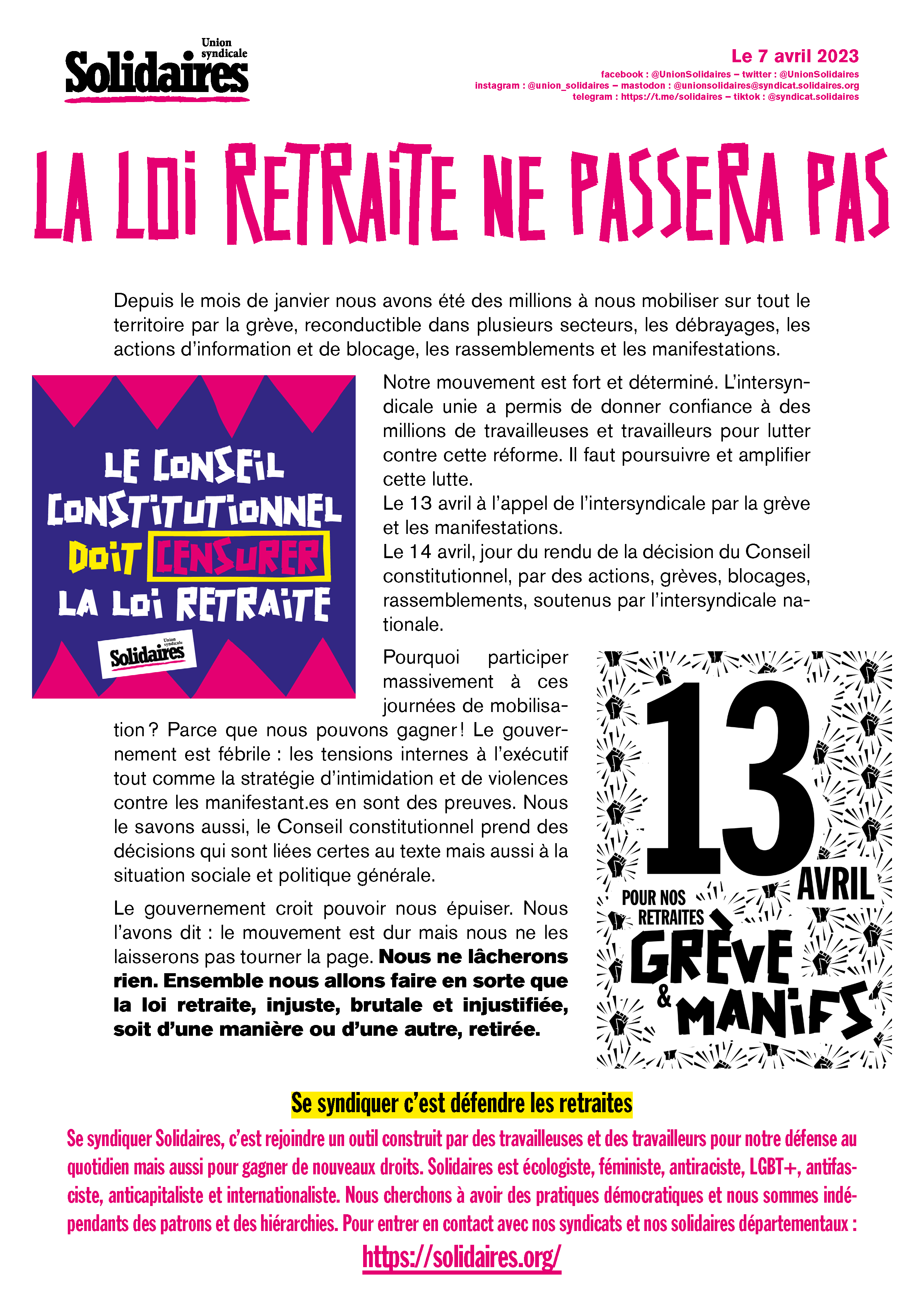 Le 13 avril à l’appel de l’intersyndicale par la grève et les manifestations.
