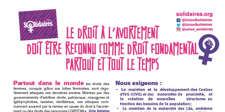 - ASSO Solidaires appelle à se mobiliser massivement à l’occasion de la Journée Internationale pour le droit à l’avortement, le 28 septembre ! TOUTES ET TOUS DANS LA RUE POUR LE DROIT à L’IVG !