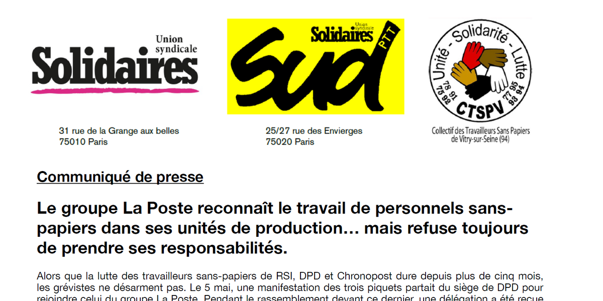 Pour notre part, nous ne sommes pas dupes et continuons à revendiquer que la Poste rende enfin justice à ces travailleurs, en fournissant les documents nécessaires à leur régularisation.