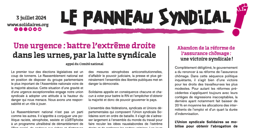 Le premier tour des élections législatives est un coup de tonnerre. Le Rassemblement national est en position de disposer du groupe parlementaire le plus important de l’Assemblée nationale voire de la majorité absolue. Cette situation d’une gravité et d’une urgence exceptionnelles engage notre union syndicale à adopter une attitude à la hauteur du danger qui nous menace. Nous avons une responsabilité et un rôle à jouer.