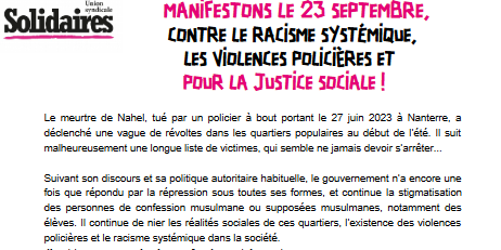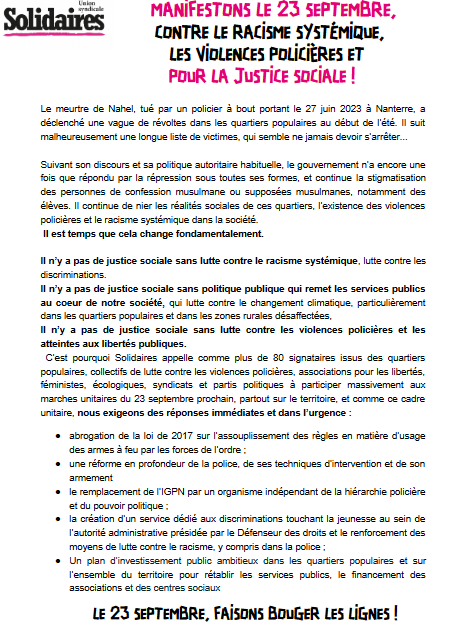 C’est pourquoi Solidaires appelle comme plus de 80 signataires issus des quartiers populaires, collectifs de lutte contre les violences policières, associations pour les libertés, féministes, écologiques, syndicats et partis politiques à participer massivement aux marches unitaires du 23 septembre prochain, partout sur le territoire, et comme ce cadre unitaire, nous exigeons des réponses immédiates et dans l’urgence :