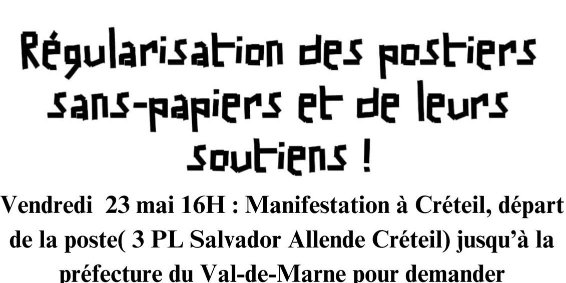 Avec les travailleurs sans-papiers du piquet Chronopost Alfortville Contre les OQTF, pour leur régularisation, Vendredi 23 mai 2025 - 16H Manifestation de La Poste, 3 Place S. Allende, jusqu’à la préfecture à Créteil.