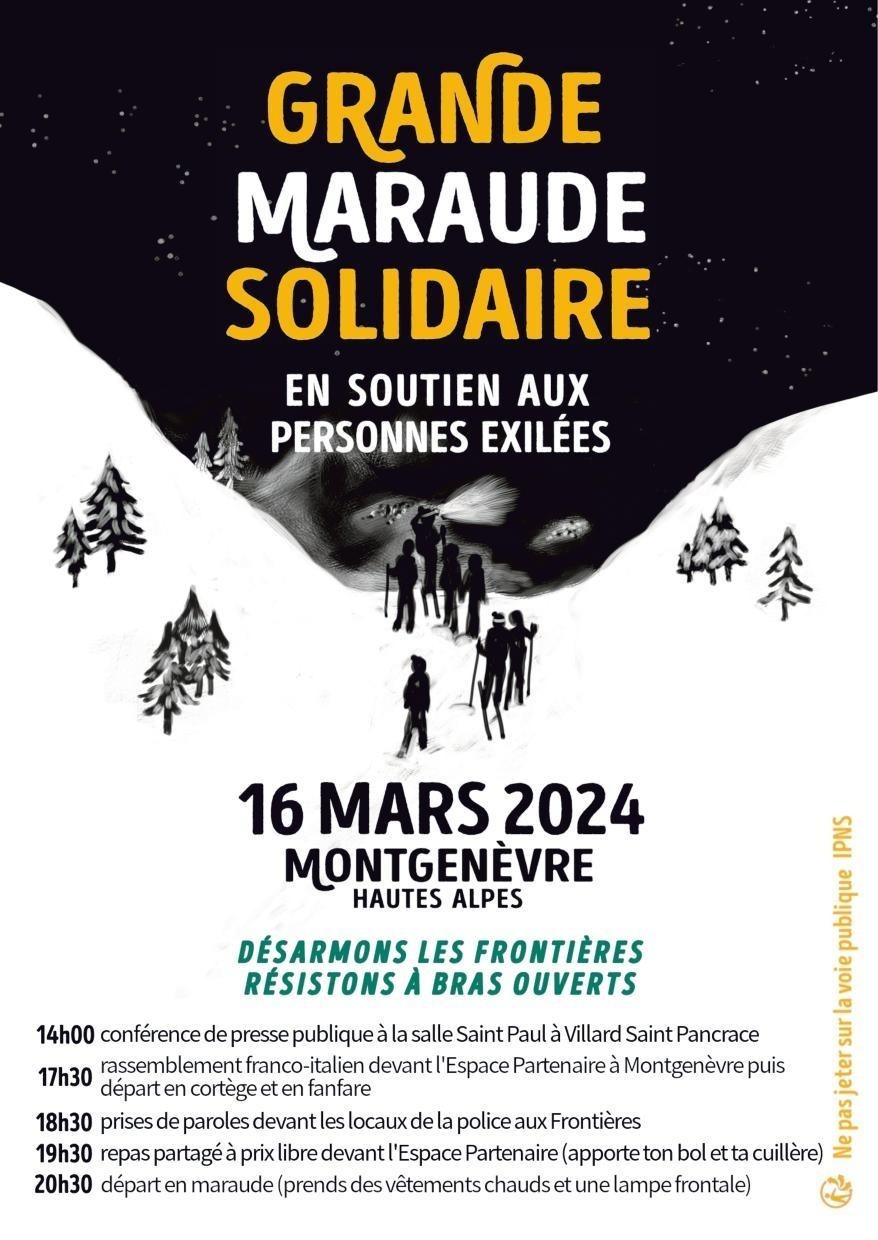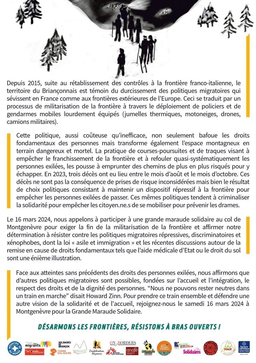 Le 16 mars 2024, nous appelons à participer à une grande maraude solidaire au col de Montgenèvre pour exiger la fin de la militarisation de la frontière et affirmer notre détermination à résister contre les politiques migratoires répressives, discriminatoires et xénophobes, dont la loi « asile et immigration » et les récentes discussions autour de la remise en cause de droits fondamentaux tels que l'aide médicale d'Etat ou le droit du sol sont une énième illustration.