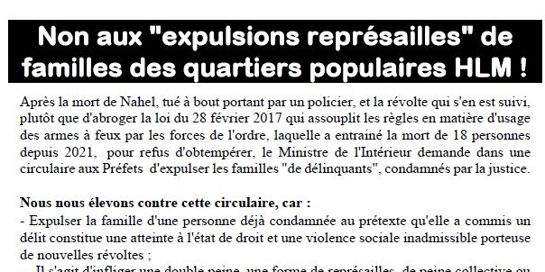 Après la mort de Nahel, tué à bout portant par un policier, et la révolte qui s'en est suivi, plutôt que d'abroger la loi du 28 février 2017 qui assouplit les règles en matière d'usage des armes à feux par les forces de l'ordre, laquelle a entrainé la mort de 18 personnes depuis 2021, pour refus d'obtempérer, le Ministre de l'Intérieur demande dans une circulaire aux Préfets d'expulser les familles "de délinquants", condamnés par la justice.