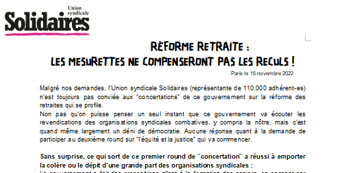 Malgré nos demandes, l’Union syndicale Solidaires (représentante de 110.000 adhérent-es) n’est toujours pas conviée aux “concertations” de ce gouvernement sur la réforme des retraites qui se profile.