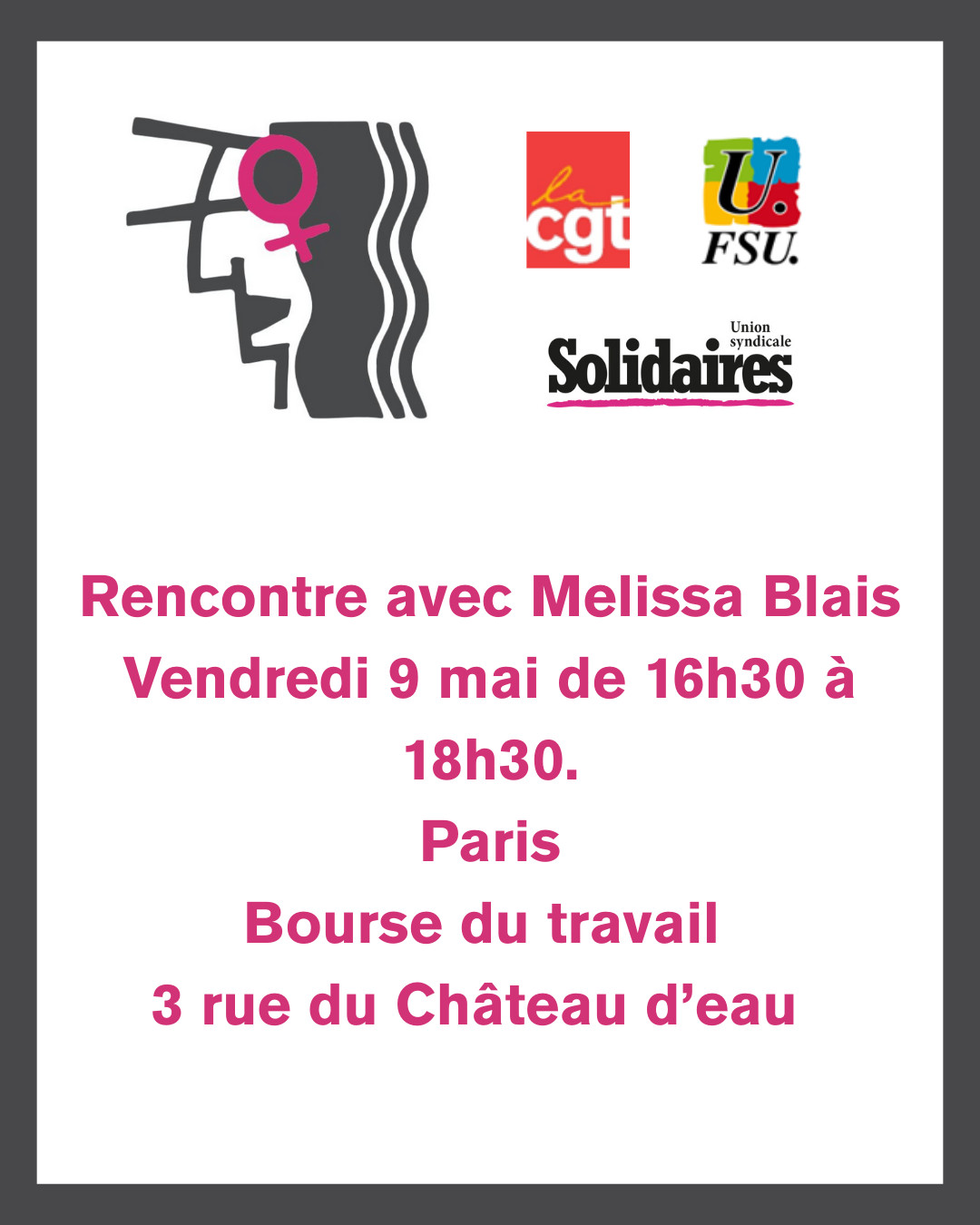 Dans la suite des intersyndicales femmes, la CGT, la FSU et Solidaires vous invite à rencontrer Mélissa Blais pour échanger sur les mouvements masculinistes d'hier et sur l’attentat anti-féministes de Polytechnique, le vendredi 9 mai de 16h30 à 18h30 à la Bourse du Travail, 3 rue du Chateau d'Eau à Paris, salle Eugène Varlin. Elle présentera aussi son dernier livre : "L'attentat antiféministe de Polytechnique. Une mémoire collective en transformation".