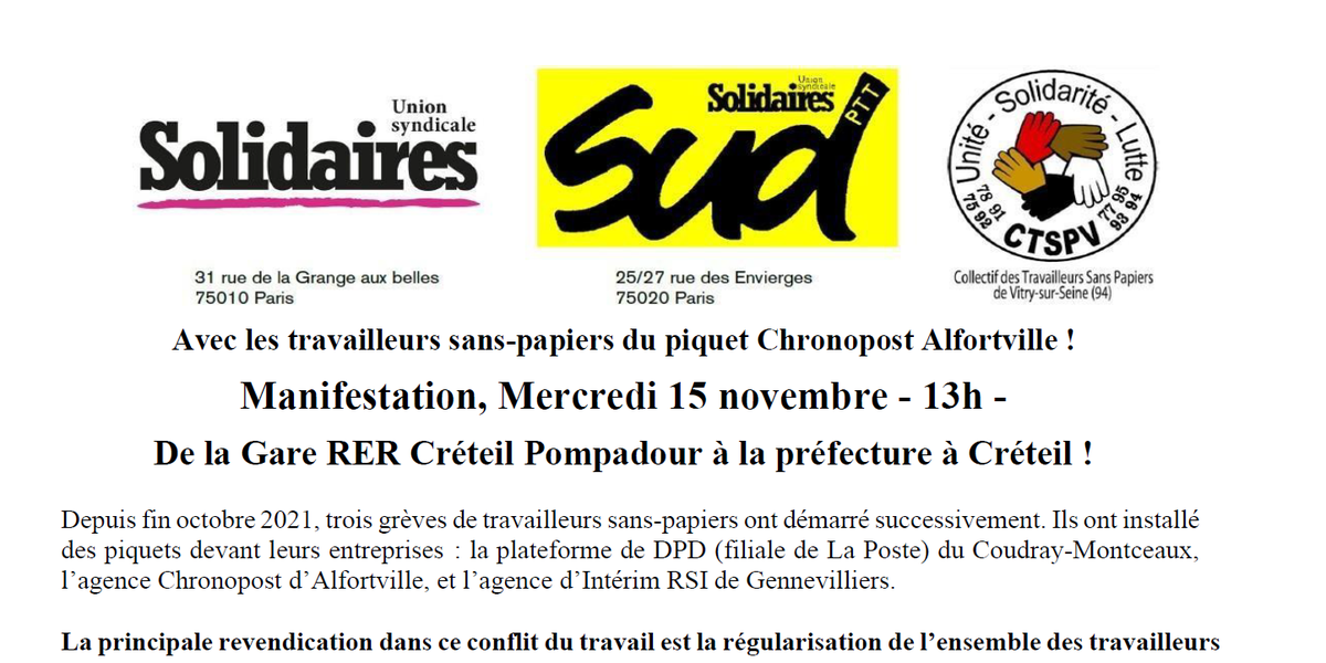 (sans-papiers) Manifestation en soutien au piquet Chronopost Alfortville à Créteil le mercredi 15 novembre 2023