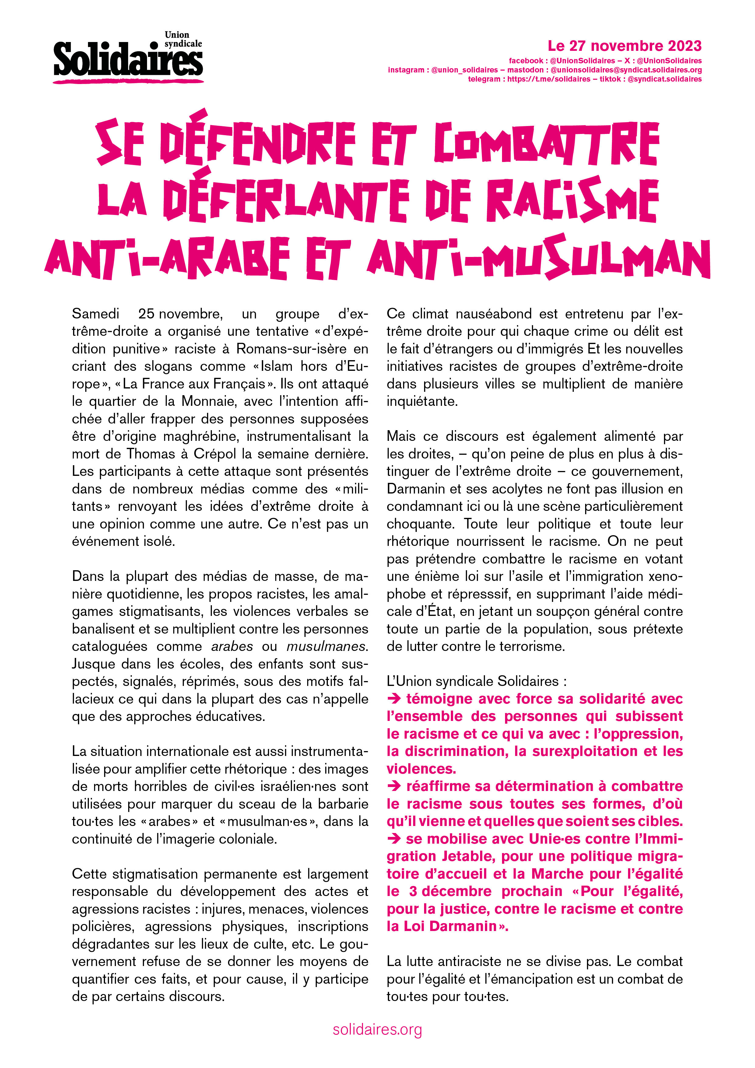 - témoigne avec force sa solidarité avec l’ensemble des personnes qui subissent le racisme et ce qui va avec : l’oppression, la discrimination, la surexploitation et les violences.