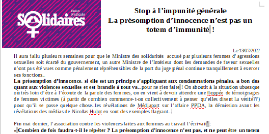 - Pour le Conseil d’Etat, toujours pas de violation du principe de présomption d’innocence dans le cas d’un fonctionnaire sanctionné avant que le juge pénal ne se soit prononcé3. Idem en cas de révocation d’un élu4- La Cour de cassation valide la condamnation d’un employeur pour harcèlement sexuel alors que le salarié mis en cause a été relaxé des mêmes faits5. Il est temps d’écouter la parole des femmes ! Les agresseurs sexuels doivent être suspendus, démissionnés ! Solidaires continuera sa lutte contre les violences sexistes et sexuelles