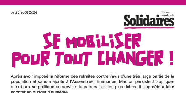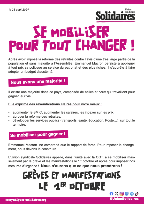 L’Union syndicale Solidaires appelle, dans l’unité avec la CGT et la FSU, à se mobiliser massivement par la grève et les manifestations le 1er octobre pour imposer nos mesures d’urgence !