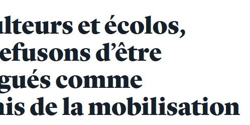 Avec cette tribune nous nous adressons à tous les agriculteurs et agricultrices ayant manifesté leur colère ces derniers jours, mais aussi à toutes celles et ceux qui hésiteraient encore à les rejoindre. Nous, organisations écologistes, paysan-nes et militant-e-s pour un autre modèle agricole depuis des décennies partageons cette colère, et refusons le discours dominant qui voudrait faire de nous vos ennemis.