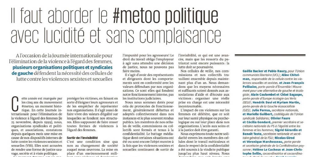 Tribune Inter-Organisations à l’occasion du 25 novembre 2022 : Journée internationale de lutte contre les violences à l’égard des femmes - parue dans Le Monde le 25 novembre https://www.lemonde.fr/idees/article/2022/11/25/il-faut-aborder-le-metoo-politique-avec-lucidite-et-sans-complaisance_6151587_3232.html