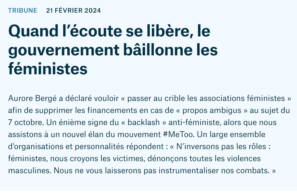Dimanche 11 février, Aurore Bergé, Ministre déléguée de l'Égalité entre les femmes et les hommes, de la Diversité et de l'Égalité des chances a déclaré vouloir « passer au crible toutes les associations féministes soutenues financièrement par le gouvernement » afin de supprimer les financements de celles qui auraient tenu des « propos ambigus au sujet du 7 octobre ». Depuis des années, les organisations féministes alertent sur l’indigence des budgets alloués à la lutte contre les violences sexistes et sexuelles et dénoncent l’inaction des pouvoirs publics. Avec cette déclaration, Aurore Bergé et le gouvernement font diversion pour se déresponsabiliser de la lutte contre les violences en France.