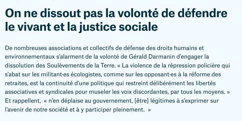 De nombreuses associations et collectifs de défense des droits humains et environnementaux s'alarment de la volonté de Gérald Darmanin d'engager la dissolution des Soulèvements de la Terre. « La violence de la répression policière qui s'abat sur les militant·es écologistes, comme sur les opposant·es à la réforme des retraites, est la continuité d'une politique qui restreint délibérément les libertés associatives et syndicales pour museler les voix discordantes, par tous les moyens. » Et rappellent,  « n’en déplaise au gouvernement, [être] légitimes à s’exprimer sur l’avenir de notre société et à y participer pleinement.  »