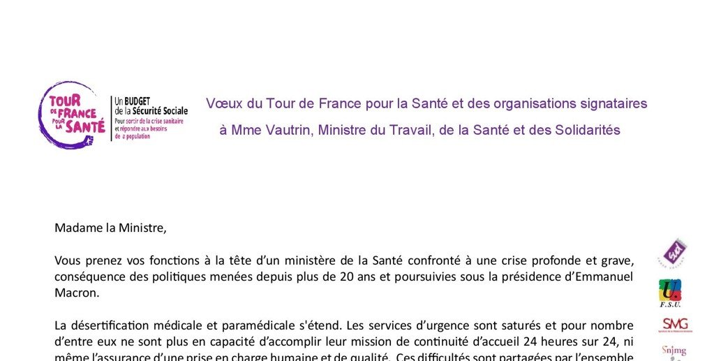Voeux du Tour de France pour la Santé et des organisations signataires à Mme Vautrin, Ministre du Travail, de la Santé et des Solidarités