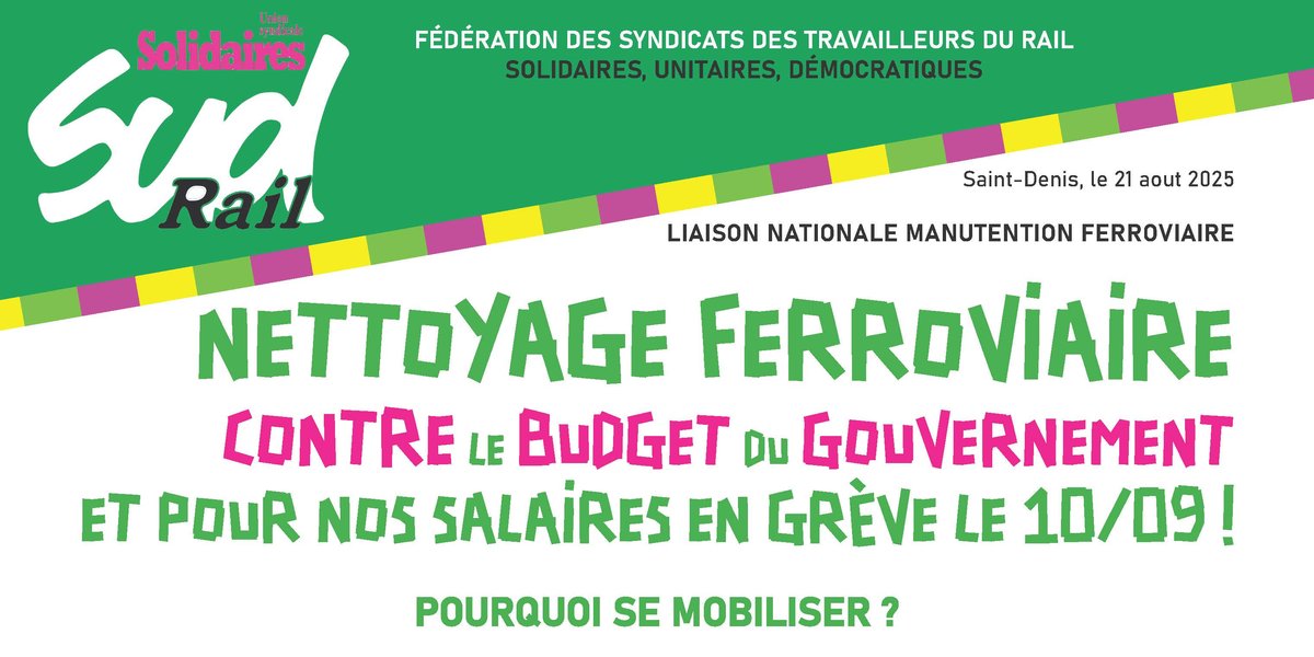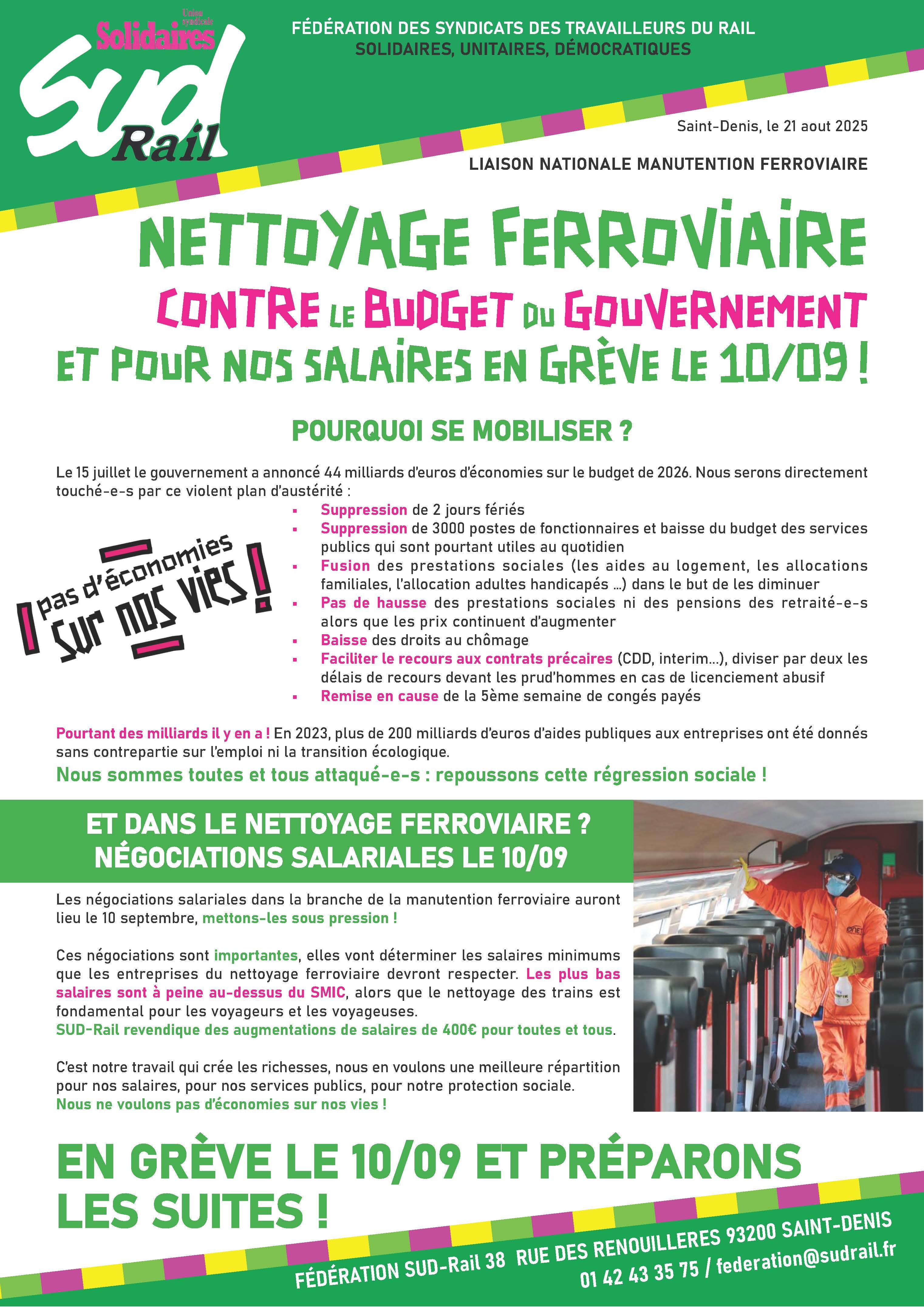 NETTOYAGE FERROVIAIRE : CONTRE LE BUDGET DU GOUVERNEMENT ET POUR NOS SALAIRES EN GRÈVE LE 10/09 !