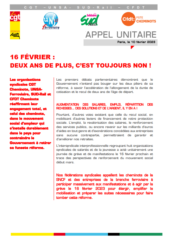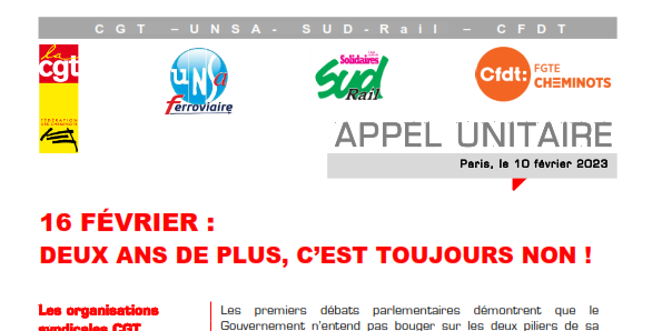 Les organisations syndicales CGT Cheminots, UNSA Ferroviaire, SUD-Rail et CFDT Cheminots réaffirment leur engagement total, et celui des cheminots, dans le mouvement social d’ampleur qui s’installe durablement dans le pays pour contraindre le Gouvernement à retirer sa funeste réforme.