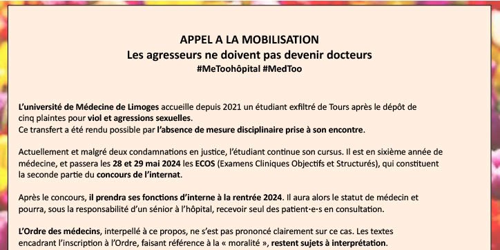 - Nous serons le MERCREDI 29 MAI 2024 à 18h (dernier jour des ECOS) devant le ministère de la Santé à Paris, pour exiger une intervention gouvernementale et dénoncer plus largement les violences sexuelles et sexistes, la culture du viol et l’impunité dans les études en santé et le milieu médical. Les ECOS représentent le dernier verrou entre l’agresseur et l’internat de médecine.