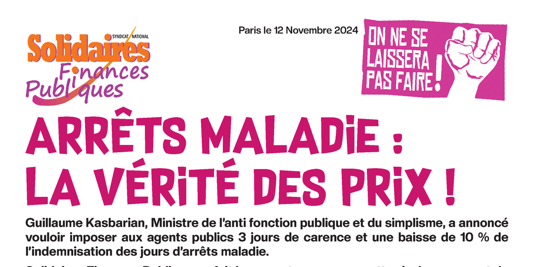 Guillaume Kasbarian, Ministre de l’anti fonction publique et du simplisme, a annoncé vouloir imposer aux agents publics 3 jours de carence et une baisse de 10 % de l’indemnisation des jours d’arrêts maladie. Solidaires Finances Publiques a fait les comptes pour permettre à chaque agent de la DGFiP de mesurer l’impact financier de ces dispositions scandaleuses et injustes.