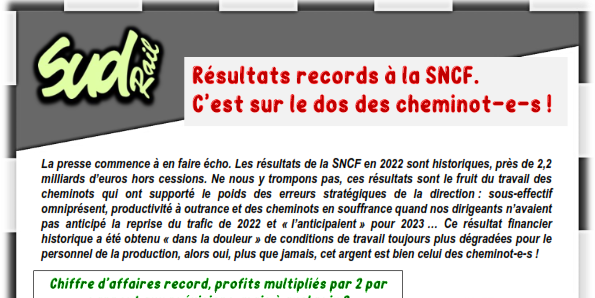 La presse commence à en faire écho. Les résultats de la SNCF en 2022 sont historiques, près de 2,2 milliards d’euros hors cessions. Ne nous y trompons pas, ces résultats sont le fruit du travail des cheminots qui ont supporté le poids des erreurs stratégiques de la direction.