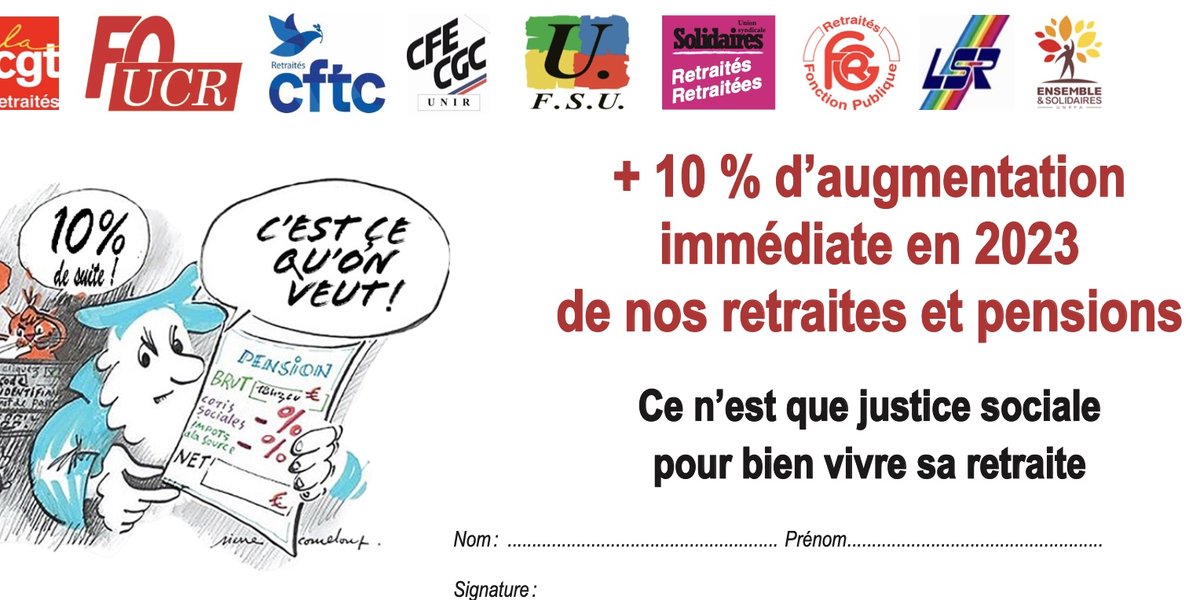 Un tract accompagne cette pétition afin d’expliciter nos revendications en matière de niveau des pensions : il faut une augmentation immédiate, chiffrée cette fois en pourcentage (10 %), même si un chiffrage par un montant identique pour toutes et tous aurait été plus égalitaire (par exemple, 200 euros tout de suite, pour tout le monde). En tout état de cause, cette exigence d’une augmentation « immédiate » veut répondre à l’urgence face aux décalages constatés depuis 2014 entre l’évolution des pensions et l’évolution des salaires et des prix (dans un contexte de forte inflation), sachant que nous demandons aussi qu’aucune pension à taux plein ne soit inférieure au SMIC, ce qui conduirait à une augmentation plus importante des basses pensions.
