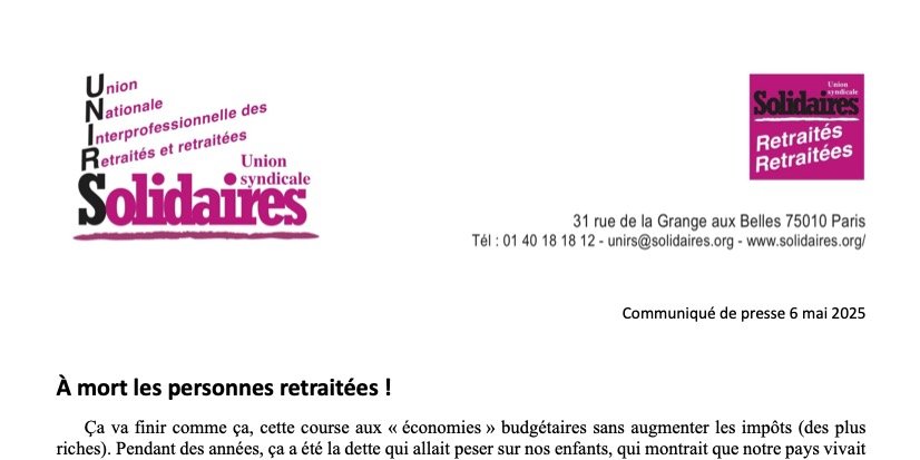 L’Union Nationale Interprofessionnelle des Retraitées et Retraités Solidaires continue de dénoncer ces choix politiques et de s’y opposer.