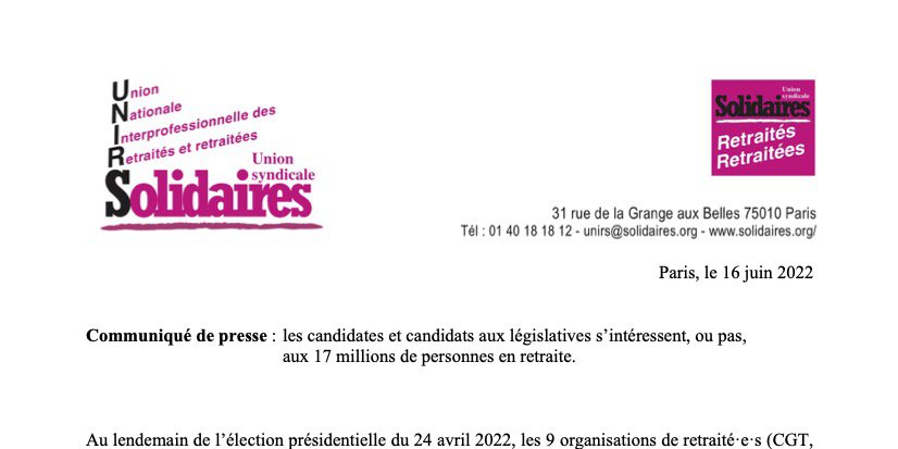 Les retraité·e·s Solidaires UNIRS rappellent que les élections législatives ne sont pas indifférentes aux choix politiques qui seront ceux du prochain gouvernement. En tout état de cause, les retraitées et retraités de Solidaires, en commun avec les autres organisations de retraité·e·s, continueront de porter leurs revendications sur le pouvoir d’achat, la santé et la perte d’autonomie, les services publics et de les exprimer dans leurs manifestations.