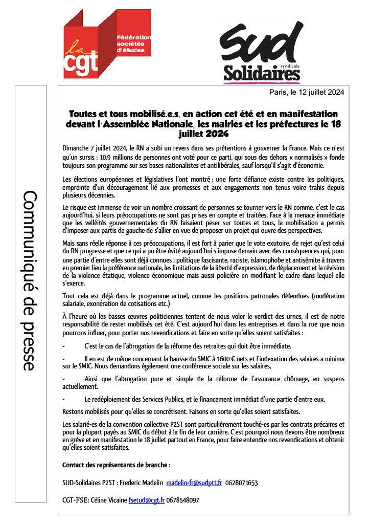 SUD-Solidaires P2ST : Frederic Madelin madelin-fr@sudptt.fr 0628071653