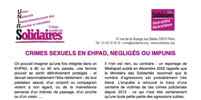 Des député.e.s de la majorité ont déposé fin 2022 une proposition de loi sur le bien-vieillir, qui comprend un volet de lutte « contre les maltraitances ». Voilà bien la preuve de la pusillanimité des responsables politiques : pourquoi ne pas poser clairement le problème des crimes sexuels en EHPAD, puisque c’est de cela qu’il s’agit ?