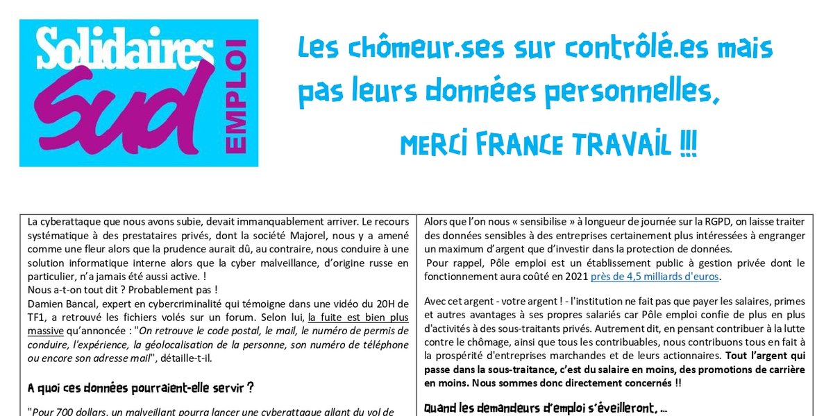 CYBERATTAQUE : les chômeur.ses sur-contrôlé.e.s, pas leurs données personnelles. Merci France Travail !