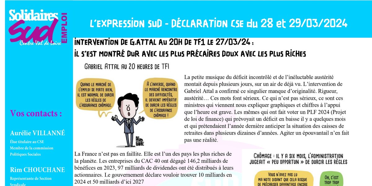Déclaration SUD au CSE du 29 et 30/04/2024 - France Travail Région Centre