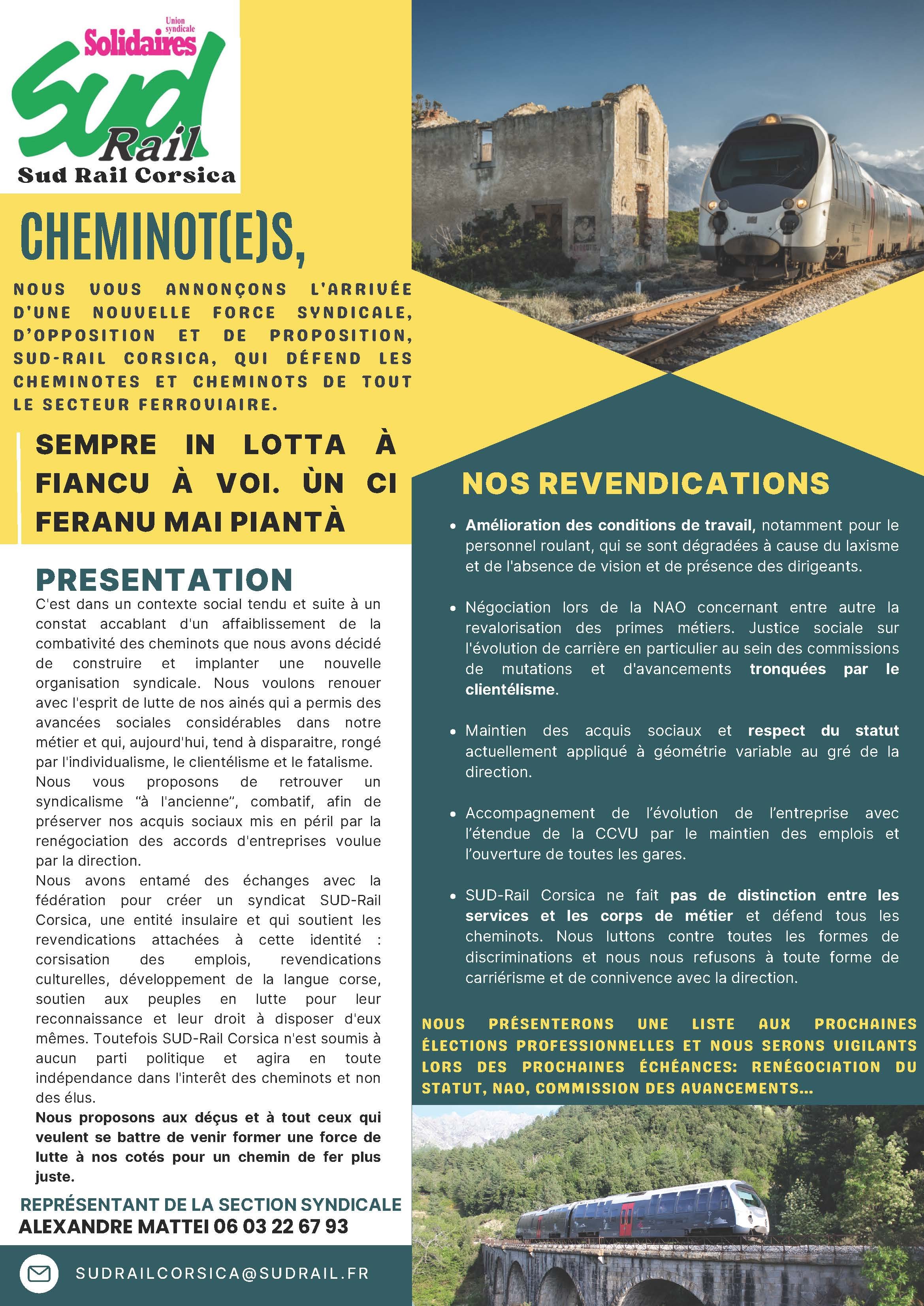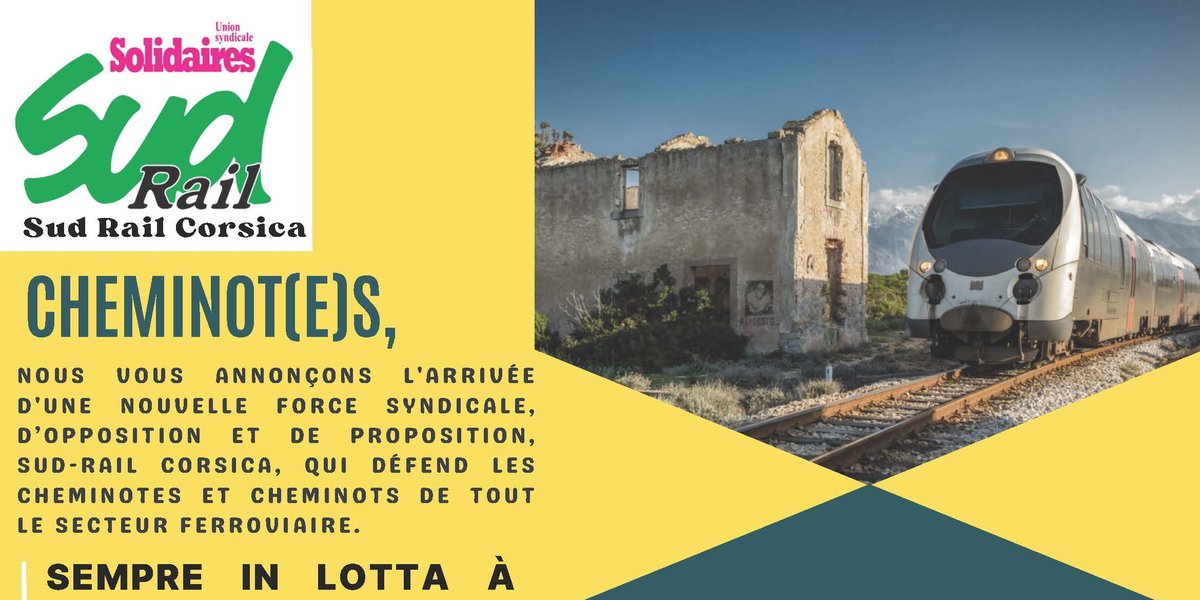 Nous vous annonçons l'arrivée d'une nouvelle force syndicale, d'opposition et de proposition, SUD-Rail Corsica, qui défend les cheminotes et cheminots de tout le secteur ferroviaire.