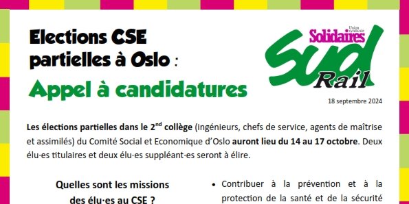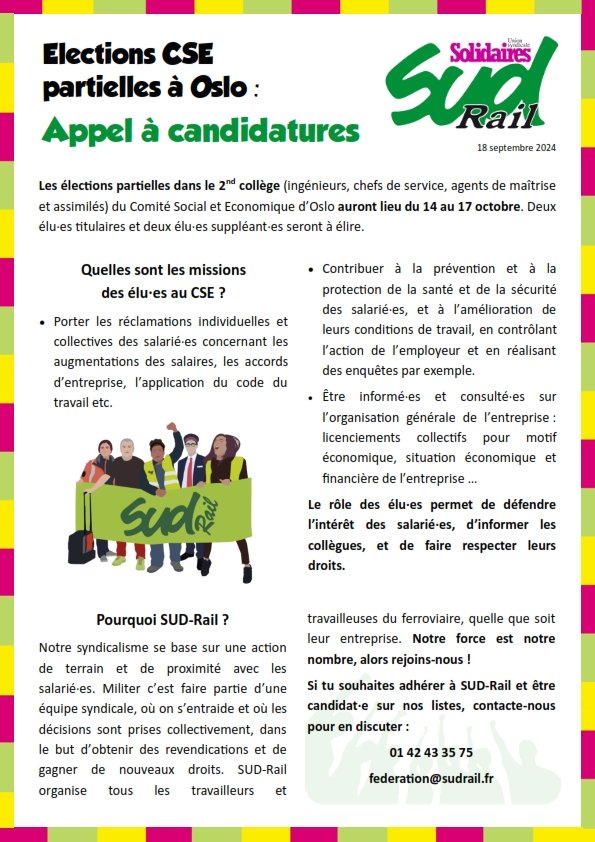 Les élections partielles dans le 2nd collège (ingénieurs, chefs de service, agents de maîtrise et assimilés) du Comité Social et Economique d’Oslo auront lieu du 14 au 17 octobre. Deux élu·es titulaires et deux élu·es suppléant·es seront à élire dans cette entreprise ferroviaire du Groupe SNCF